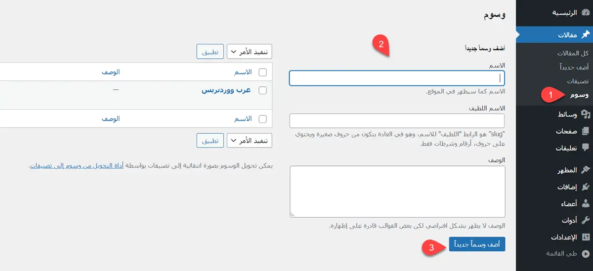 ويمكنك من هذه المنطقة ضمن لوحة تحكم ووردبريس أن تضيف الوسوم وتضيف وصفًا لها مع الاسم، إلى جانب إمكانية إضافة الاسم اللطيف الخاص بها، وهو الرابط المخصص، مثلًا إن كتبت "إضافات" فإن رابط الوسم سوف يكون website.com/tags/إضافات.