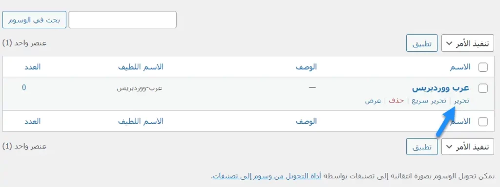وأما بالنسبة للوسوم الموجودة بالفعل فإنك قادر على تحرير الإعدادات الخاصة بها بالضغط على كلمة "تحرير":