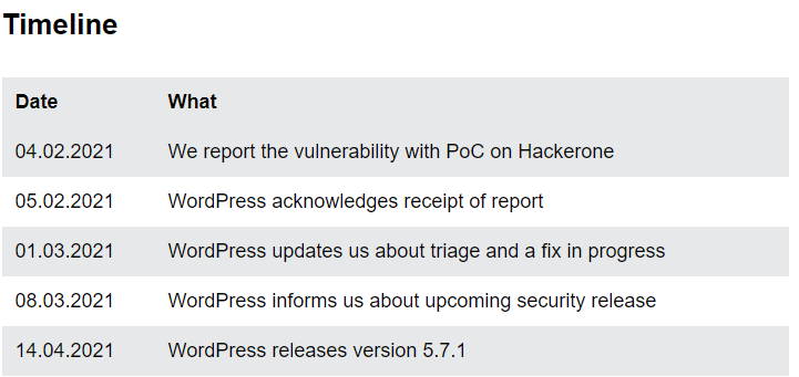 واختتامًا للمدونة، فقد أكّد الباحثون أن فريق المبرمجين والمختصين الأمنيين لدى نظام WordPress تجاوبوا بشكلٍ إيجابي وسريع مع مطالباتهم بإصلاح الثغرة، على الرغم من أن هذه العملية استمرت لأكثر من شهرين.