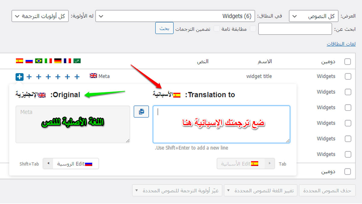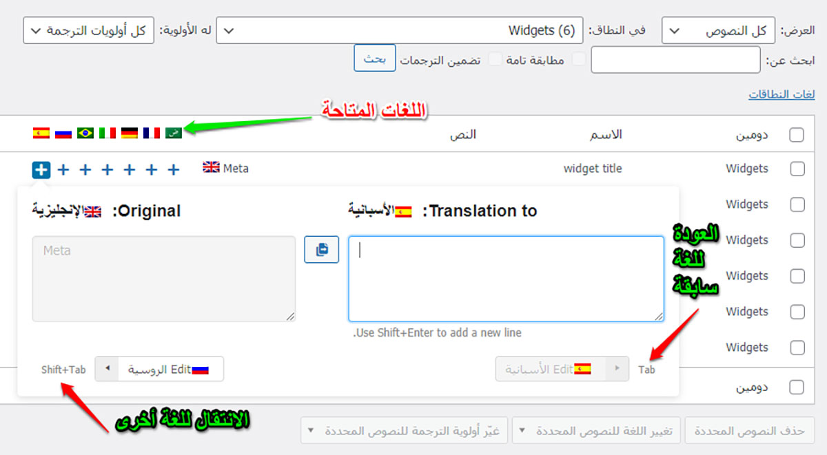 فمثلًا بعد أن تقوم بإضافة الترجمة الإسبانية. اضغط على Tab + Shift من لوحة مفاتيحك. وستنتقل للغة أخرى وهي الروسية. وبعد أن تنتهي منها. اضغط مرة أخرى على Tab + Shift لتنتقل للغة أخرى. لاحظ أيضًا أنه يمكنك الرجوع للغة الإسبانية من خلال زر Tab فقط.