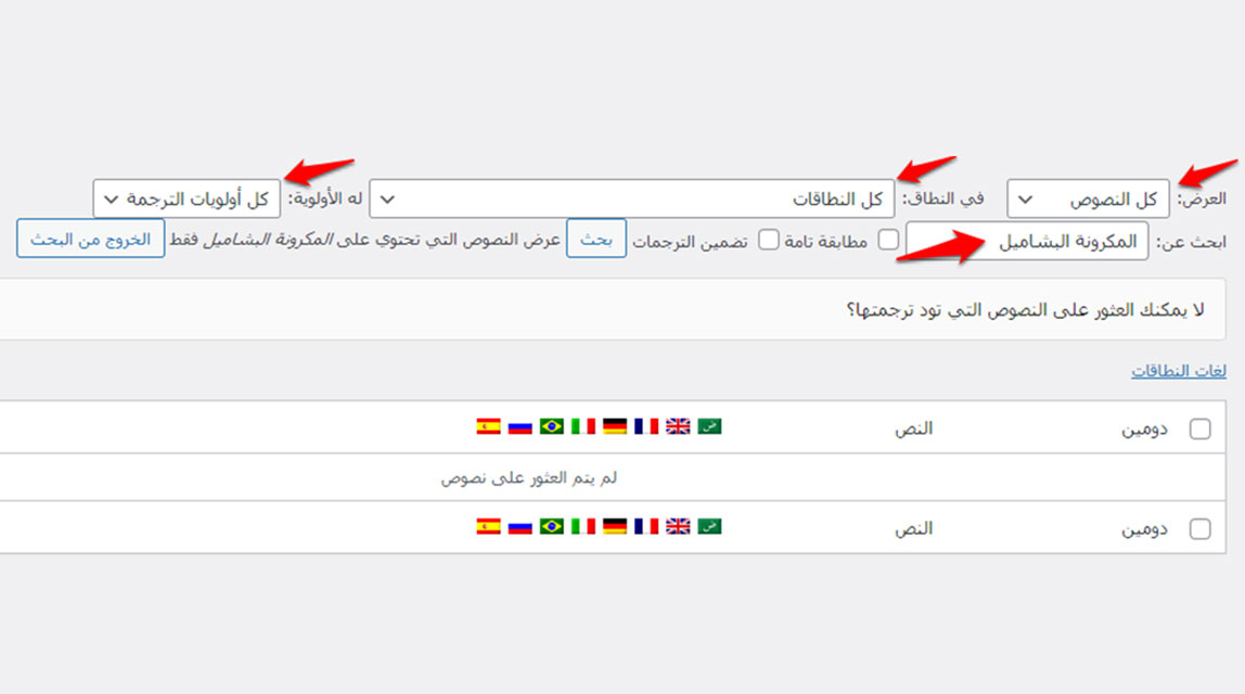 من خلال قسم String Translation أو ترجمة النصوص بالعربية يمكنك من خلال أزرار الترشيح الموجودة في الصورة أدناه أن تختار النص الذي تريد ترجمته، فقط عليك انتقاء زر الترشيح المُناسب. مثل العرض والأولوية والنطاقات. ثم اختيار كلمة بحث محددة. وفي النهاية قم بالنقر على زر بحث.