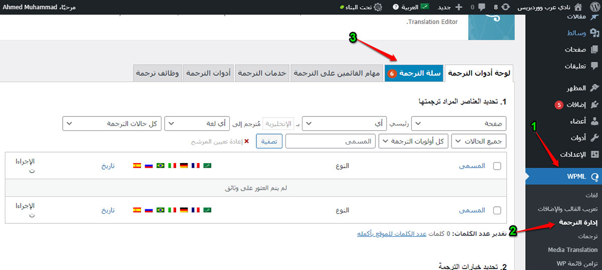 بعدها. من خلال مدير الووردبريس. قم بالذهاب لقسم إدارة الترجمة Translation Management وستجد أمامك سله الترجمة وعليها رقم 6 باللون الأحمر. وهذا معناه أنه هناك 6 مهمات ترجمة بسلة الترجمة. كما في الصورة أدناه.