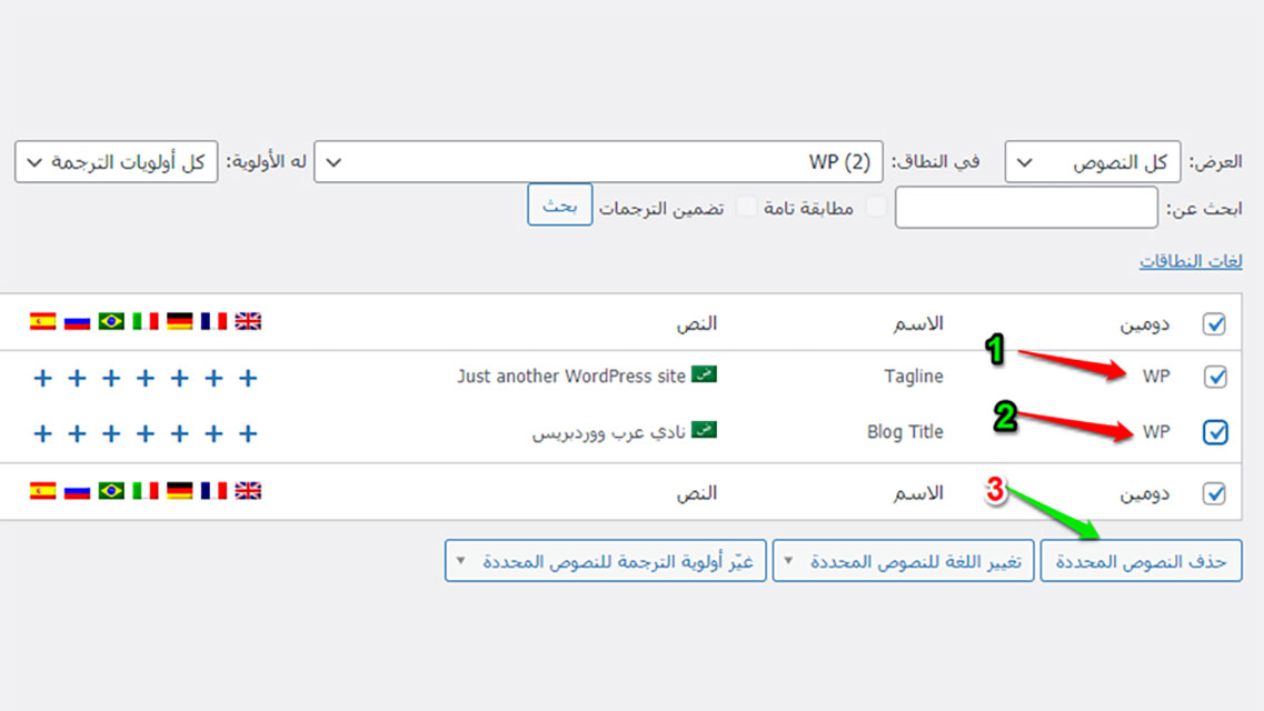 إذا أردت حذف أي نص مترجم أو غير مترجم لأي سبب. فقط يمكنك فعل هذا من خلال الذهاب من مدير الووردبريس إلى WPML ثم ترجمة النصوص. ومن خلال جدول النصوص حدد ما تريد حذفه. واختر حذف النصوص المحددة. كما في الصورة أدناه.