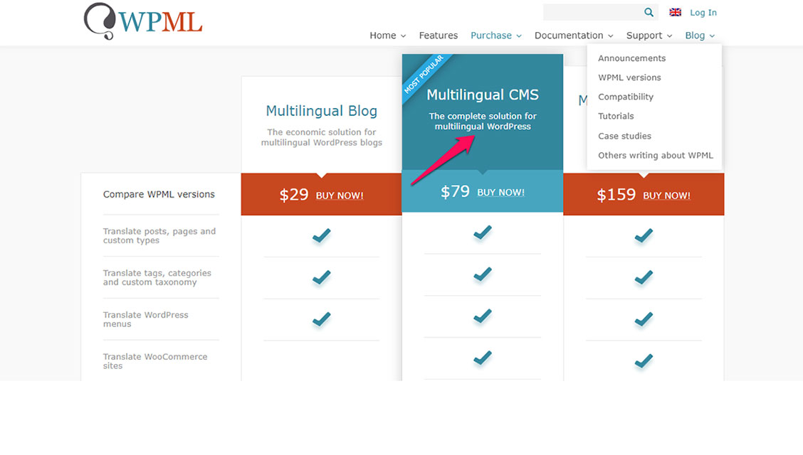 كي تنعم بمميزات إضافة WPML String Translation لترجمة النصوص عليك أولًا أن تقوم بشراء وتنزيل وتثبيت إضافة WPML من نوع Multilingual CMS والتي تبلغ تكلفتها 79$ للشراء و 59$ مقابل كل تجديد سنوي لها. لاحظ أن باقة Multilingual Blog لا تتضمن إضافة WPML String Translation. ويمكنك تنزيل باقة WPML Multilingual CMS من قسم التنزيلات من موقع WPML.
