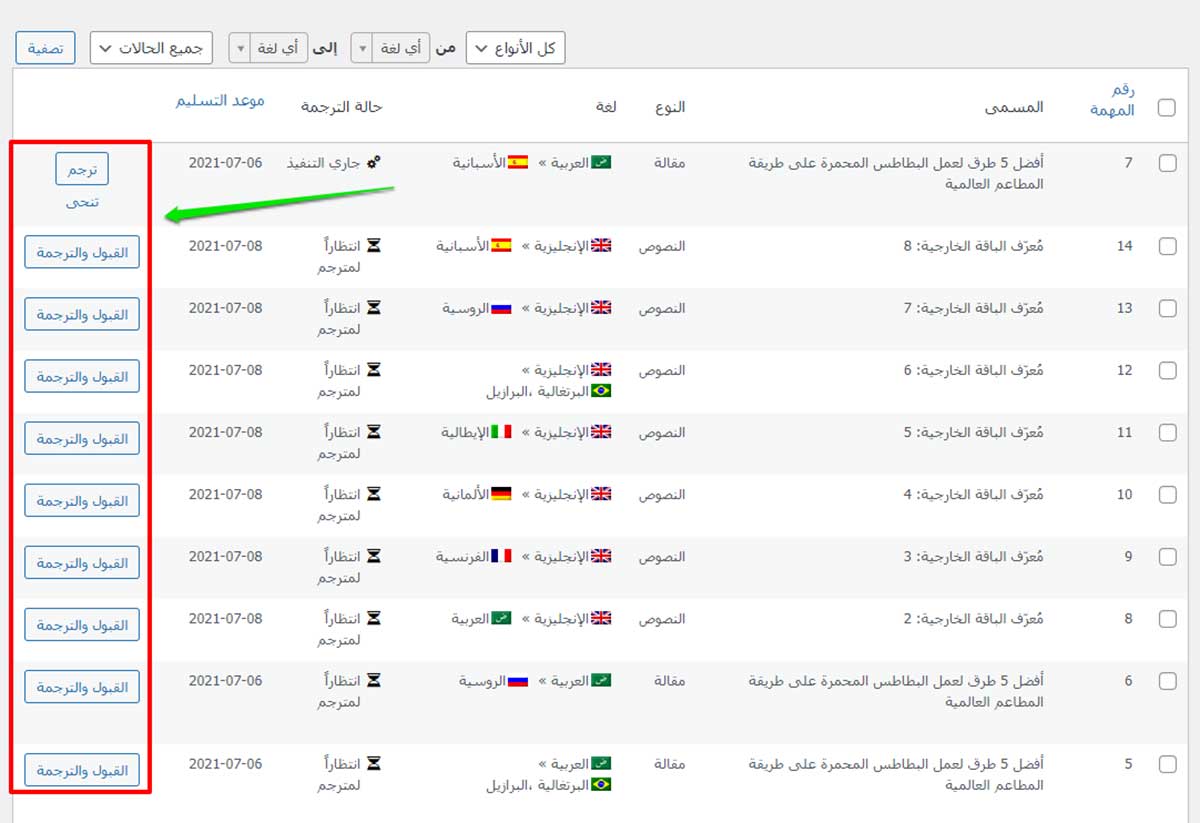 بعدها سيتم ارسالك لقائمة انتظار الترجمة والتي فيها كل مهمات الترجمة المتقدمة في موقعك. هنا يمكنك الترجمة بنفسك. أو تعيين مترجمين متخصصين. من خلال زر القبول والترجمة كما في الصورة أدناه.