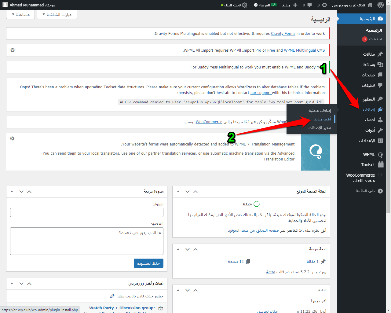 لاحظ أيضًا أن خاصية عرض المعلومات الخاصة بمشكلات بموقعك متوفرة فقط في إصدار WPML 3.1.7 فما أعلى. لذلك إذا كنت تستخدم إصدار أقدم من WPML توجب عليك التحديث، وهذا أمر يسير جدًا، فقط اذهب لمدير الووردبريس بموقعك ومن ثم اذهب لقسم الإضافات ثم قسم إضافة جديد كما في الصورة أدناه.