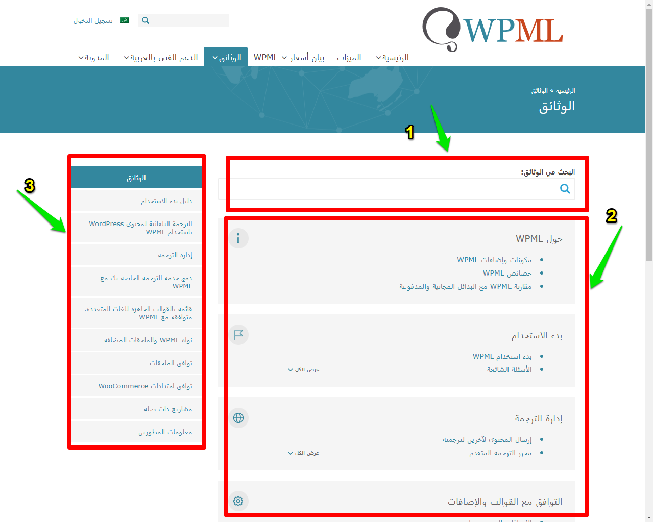 وقسم الوثائق بإضافة WPML أيضًا يُعتبر من الأقسام الرائعة والتي لا تعطيك دعم مباشر مع أحد المطورين. ولكنها توفر لك تجربة رائعة للبحث في قاعدة بيانات العملاء السابقين لإضافة WPML والذين تعثروا من قبل ووجدوا حلول لمشكلاتهم. ويمكن البحث في ثلاثة أماكن كما في الصورة أدناه.