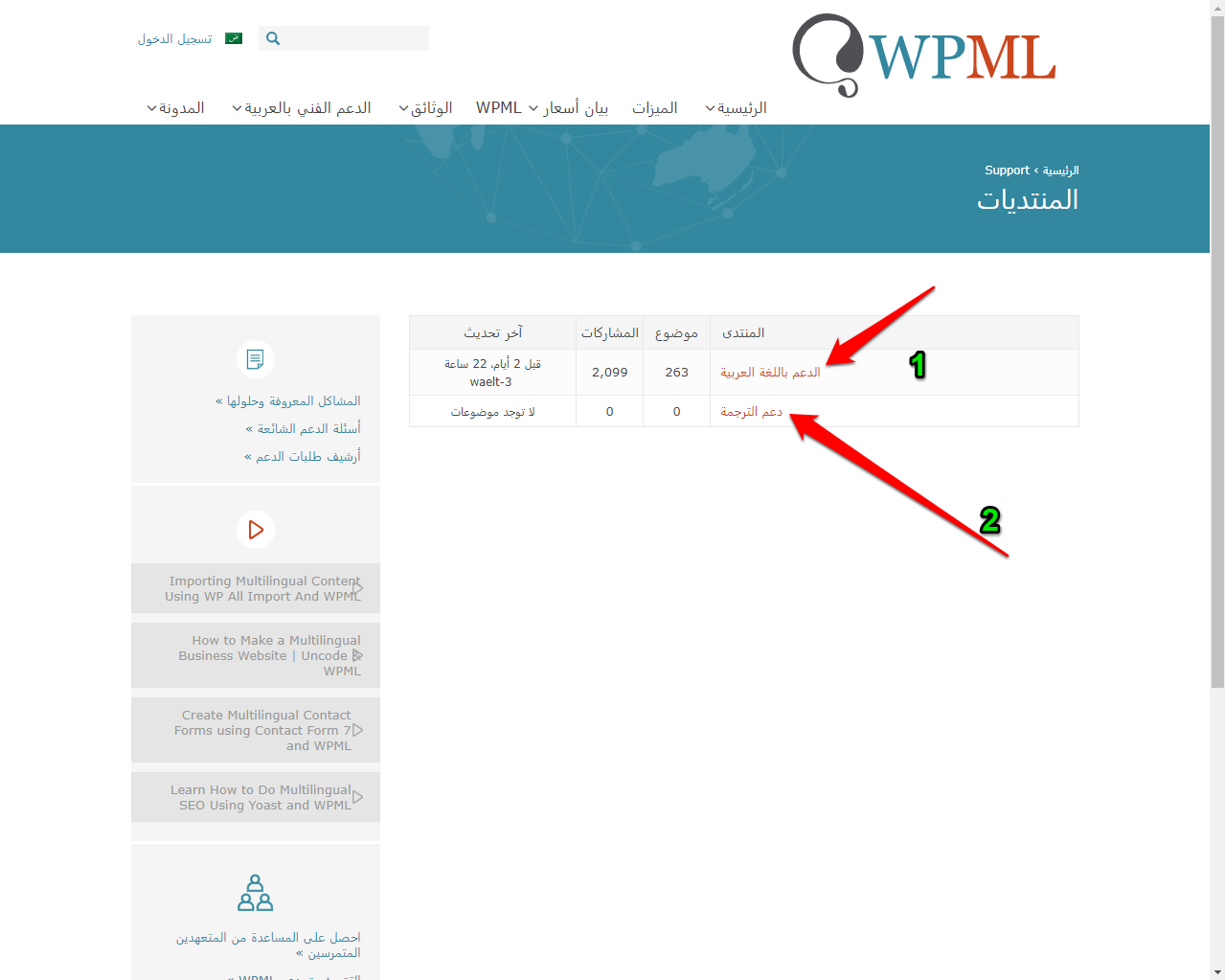 وقسم منتديات إضافة WPML أيضًا يمكنك من خلاله تقديم مشكلاتك أو أسئلتك حول إضافة WPML. والمنتديات كما في الصورة أدناه تحتوي على قسمين وهما :
