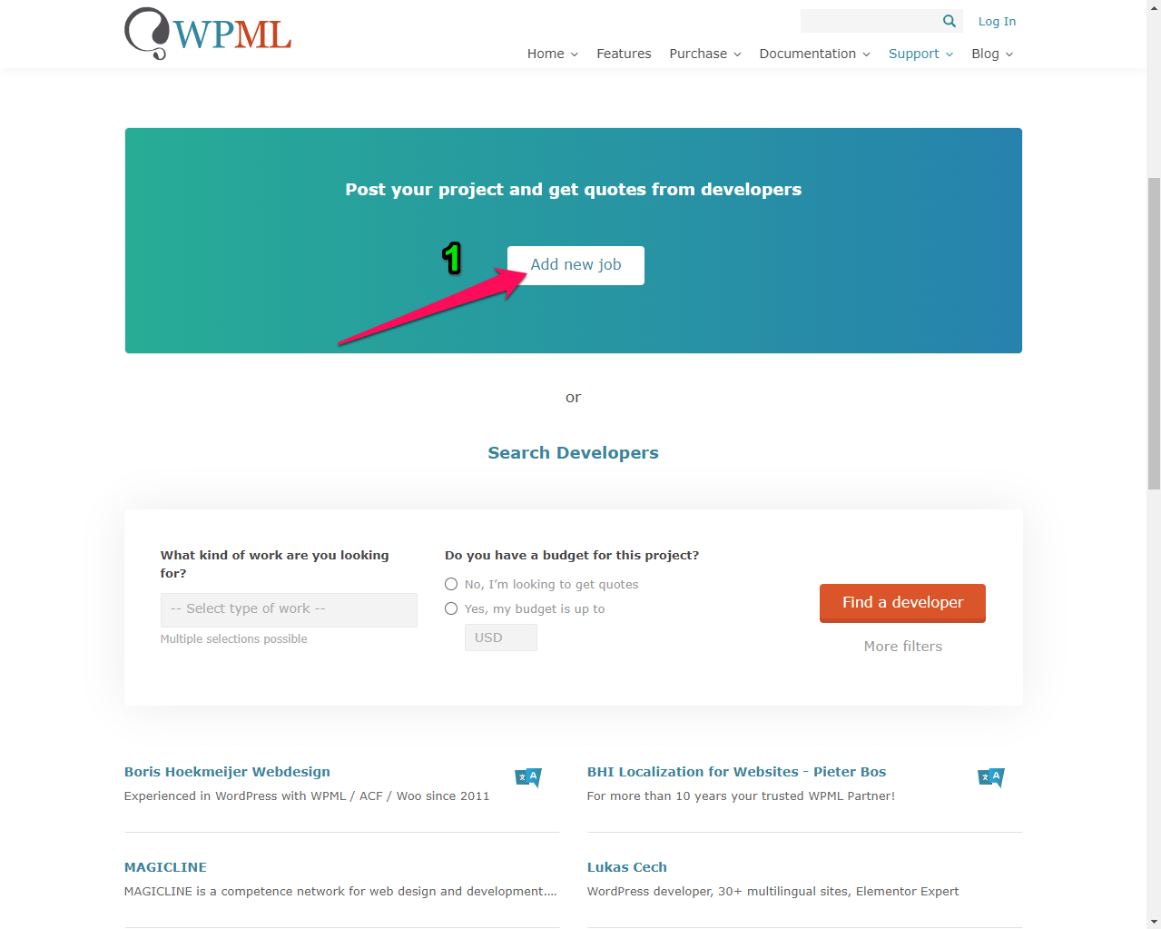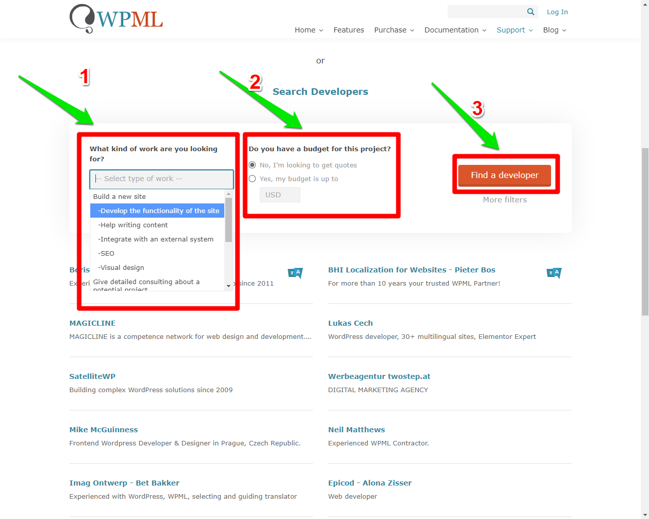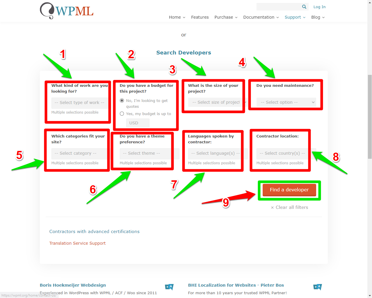 وبعد ملئ الخيارات والضغط على زر Find developer سيبحث موقع إضافة WPML عن أفضل مطور يساعدك في حل مشكلتك في أسرع وقت ممكن.