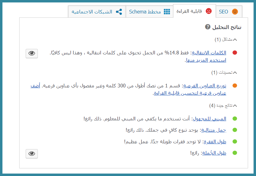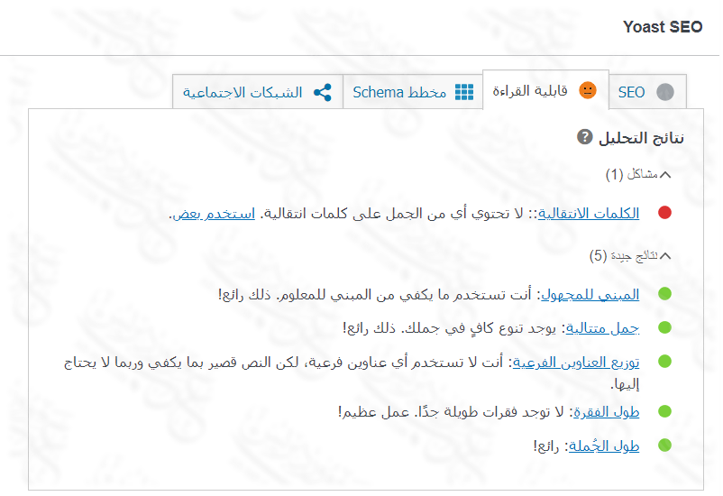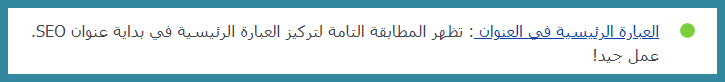 • بينما يدل اللون الأخضر على التوافق التام لمحتواك مع شروط يوست سيو وبالتالي السيو (SEO).