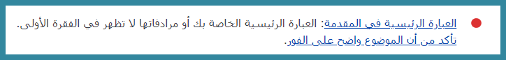 وعندما تقوم بإدخال العبارة الرئيسية، يتحول اللون الرمادي إلى لون أحمر؛ بمعنى أن المحتوى الخاص بك لا يتوافق بعد مع أي من شروط السيو. وإذا بدأت بتحقيق الشروط المدرجة في الملحق، يتحول اللون الأحمر إلى أخضر؛ يشير إلى أن محتواك بدأ يتوافق مع شروط تصدر نتائج محركات البحث.